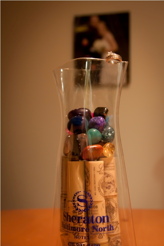 This week at work, some ladies from the Sheraton Baltimore North Hotel came in and gave us some materials about their venue (beautiful by the way!) and also a neat plastic vase. I had cleaned the apartment after the Princess Party. It was great to have the kitchen table cleaned! When we went cross country in December, we stopped at one of the many gift shops and bought some rocks…you know, the as many as you can fit in this bag for 5 bucks type…I’ve been meaning to find a neat “presentation” for them…and I figured that out tonight! The vase! So, I poured in the rocks…they were way too low in the vase…so I searched the apartment for something to raise them up….We have also been collecting corks for our friends for a project they want to do down the road….and there was an “ah ha!” moment and this was the result! (I think I spent 10-20 minutes getting the corks just right) I love that our wedding picture is in the background. It’s this beautiful collection of memories….the wedding….the many bottles of wine….and the road trip. It was also great taking a picture for me…setting something up for MY purposes. Don’t get me wrong, I LOVE photographing for others. I could write for hours about how much I absolutely adore documenting my dear client’s lives. But…it’s easy to get caught up in taking pictures only when I’m getting paid for it (heck editing pictures for that matter! It’s almost embarrassing how many personal pictures I haven’t edited yet)…so this was a great treat!