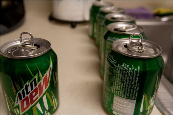 Then I went home, downloaded and back up the wedding and started editing. I needed a little fuel, so I got some Mt. Dew. I had some and so did Bret….I put our respective rings on the cans we each had….heh heh….at least they’re little!
