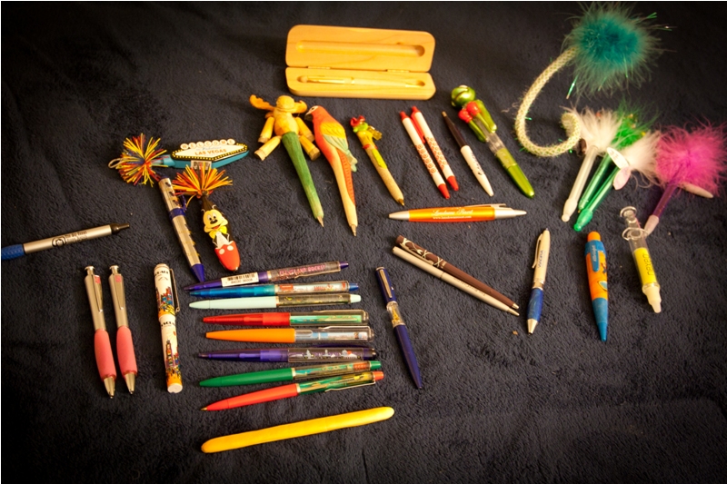 Then I decided to pull out a few of my favorites. Fuzzy pens. Fancy pens. Wood carved animal shaped pens. Clear pens with moving parts. Light up pens. Talking pens. Viagra pens (I forgot I had that one!) Pens from the US, UK and beyond!