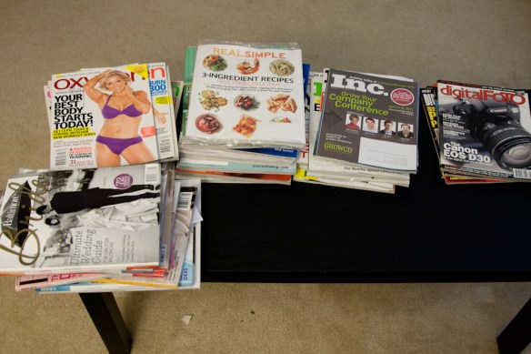 Today Bret was at work in the evening, and I decided to take a crack at the magazines under my bed. See, this is where I stash them if I can’t read them. Out of sight, out of mind. As I started pulling them out, I realized it had gotten a little out of control….