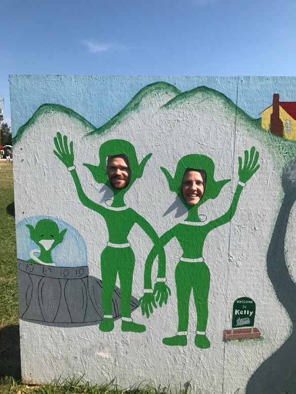 The little festival we went to was the Kelly Little Green Men Days Festival. The festival started a few years back to commemorate an alien encounter….on August 21, 1955….that’s right, 62 years ago exactly, we were watching the eclipse. Come to find out, that encounter was some of the inspiration for E.T. We only had to pay $5 for parking, and that also got us a ticket for the raffle….for an Eclipse car. (Good marketing idea right there!) That was the cheapest we saw for parking all around.