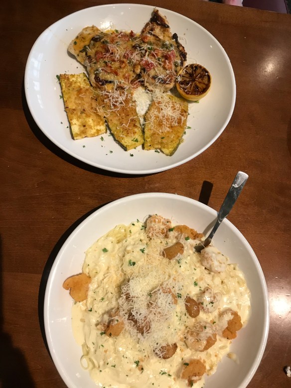 Oh my goodness, we love Olive Garden! We’ve only gone a few times, but every time is a really great time and super delicious food. Bret got a free entree which included unlimited soup and breadsticks. I got a neverending pasta bowl, and soup and breadsticks. We only got one refill of breadsticks. Seriously, I wonder how many people can actually get and eat a refill.