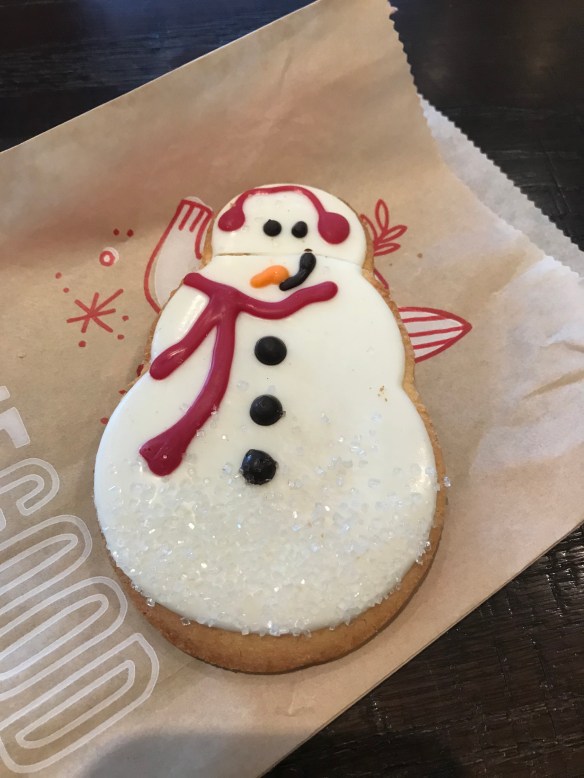 After a completely crazy week, I would say it’s summed up nicely in this picture. I was able to have a quick business coffee with one of my favorite vendors. I grabbed a cookie too. I was so hungry that I took his head off before I took a picture. Thankfully I remembered while I could piece him back together. Still would’ve been a funny picture without his head though…