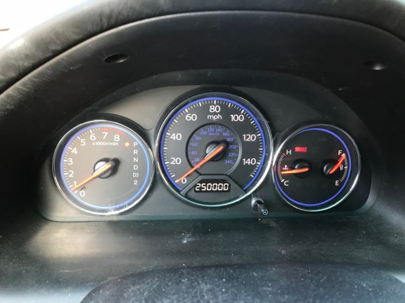 I celebrated a very important event yesterday – my car hit a quarter of a million miles. I actually pulled over to the side of the highway to Facetime with Bret to celebrate the occasion. He’s been with Sam (my car) and I for a lot of the journey. I think we figured Bret joined us around 30,000 miles.
