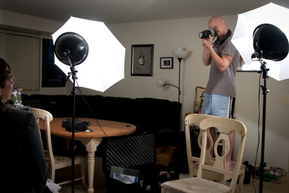 Tonight, my dear friend Bridget of K&B Bridals and Event Planning stopped by. We grabbed dinner at Jason’s Deli (you know I make ANY excuse to go there!). We did a little editing of her wedding album. AND did a last minute photo shoot! She needed a headshot for her marketing. We were hoping we could use a picture already taken (I’m Bridget’s “life photographer”…every one of her Facebook profile pictures was taken by me!)….but, we really couldn’t find one. While Bridget and I were looking at things on the computer, Bret set up our studio kit in the living room.