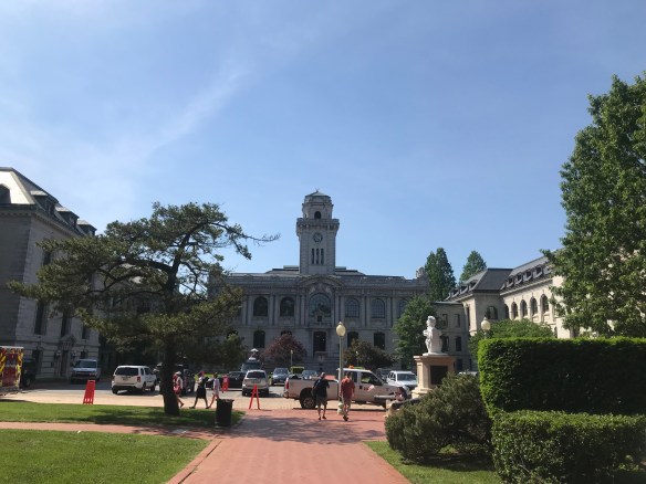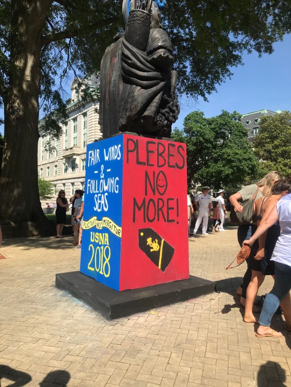 I’m lucky to work for someone who lives a block away from the Naval Academy, so it’s easy to pop over during our workday. This year, I mentioned wanting to catch the start. Typically, we head over about an hour into the attempt and we only have to wait about 15-45 minutes to catch them get the cover on the top. While I am happy to say I finally watched a full attempt, it’s not something I’ll want to repeat, unless I get a spot in the shade. Unfortunately, I subjected my poor self to 2 hours of straight sun and I have the nasty sunburn to prove it. We could have moved out of the sun, but we had scored a really great spot right next to the media platform and had a really great view.